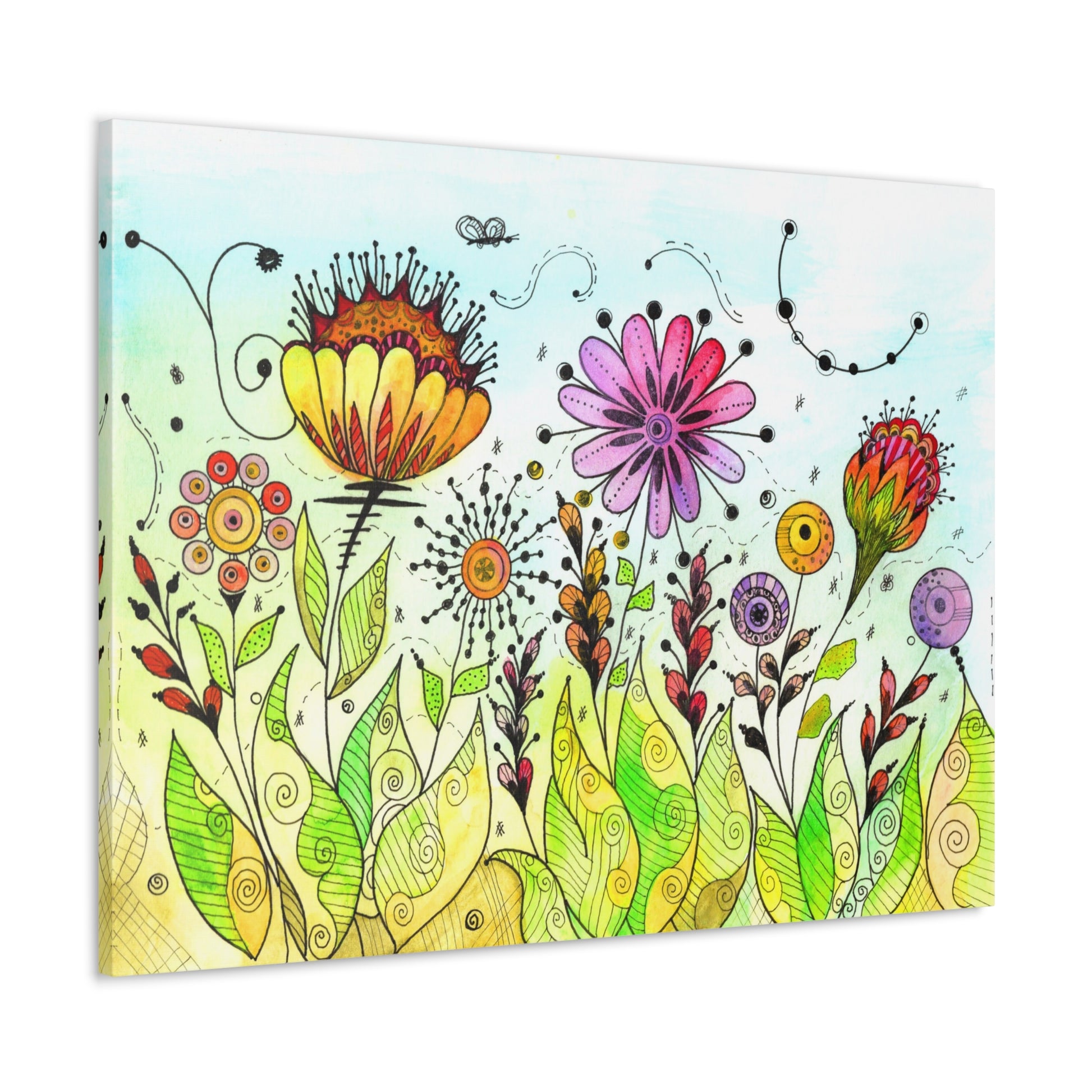 "Garden Zen 2" is a remarkable giclee print measuring 18 x 24 inches, presenting a whimsical and vibrant floral scene. The design is a feast for the eyes with its highly stylized and decorative depiction of flowers, rendered in a cheerful array of yellow, orange, pink, purple, and red hues. Each flower is unique, with intricate details like spirals, dots, and lines that enhance their charming and playful nature.